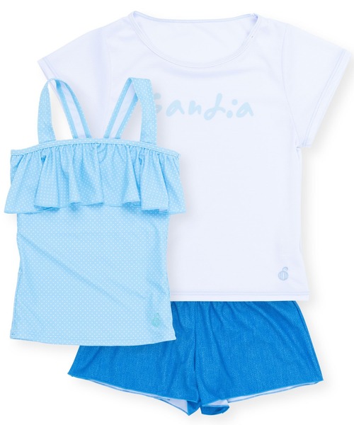 女子力アップ_ボリューム胸フリルトップス、デニム風キュロットパンツ、水陸両用ラッシュTシャツ。海でもプールでも。シンプルかわいい3点セット。ストレッチの効いた上質素材。ソフトな裏地で柔らかな肌触り。UVカットで日焼け防止。裾めくれ防止付きで安心。Vバック肩ひも。ショーツ一体型キュロット安心品質をお約束します。マットな光沢、弾力ある生地。ソフト裏地で着心地がいい。UPF50+ 最高ランク獲得の紫外線カット、洗濯しても効果持続。有害物質の検査をはじめ耐光、洗濯、生地強度などの検査をクリア。プールの塩素をしっかりガード。耐塩素素材で耐久性アップ。