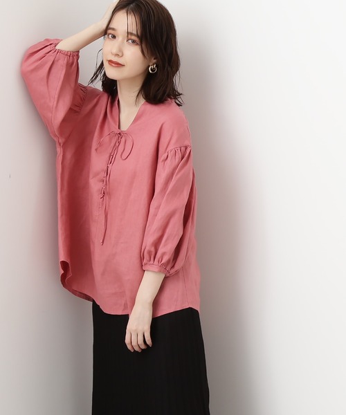 ふんわり膨らんだボリューム袖と襟元のレースアップがポイントのブラウス。清涼感のある麻素材を使用しており、これからの季節にぴったりな風合いです。7.8分袖くらいの、ぱふっとしたスリーブデザインで、トレンド感も表現しながら手首をほっそり見せてくれます。バックスタイルはヨーク切り替えで表情があり、裾をアウトしたままでもサマになります。デニムカジュアルにも、注目のハーフパンツとも相性よく、リラックスした大人のカジュアルスタイルを楽しめます。