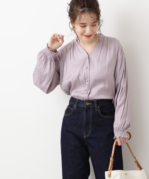 微光沢のサテンで顔映りを華やげるブラウス。ふんわりとしたスリーブで心地よく、袖口はシャーリングゴムでフィットするので、腕まくりもしやすいです。ネック周りや背中のギャザーディテールで表情感があり、1枚でフェミニンな印象を与えてくれます。リモート映えもでき、休日はデニムカジュアルにも、通勤スタイルではきれいめスカートと合わせると違った雰囲気で着回しできます。