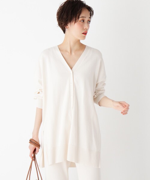 Lux organic cotton(リュクス オーガニック コットン)Vネックロングカーディガン※WEB限定サイズあり【素材】Lux organic cotton(リュクス オーガニック コットン)を使用しています。オーガニックコットンとは、認証機関に認められた農地で、栽培に使われる農薬・肥料の厳格な基準を守って育てられた綿花のことです。「Lux organic cotton」は、オーガニック綿花のうち、繊維長が長く滑らかで光沢感のある綿を用いた、柔らかな肌触りの素材です。このニットは、良質な細番手の糸を軽やかな天竺編みにし、驚くほど滑らかで美しい表面感に仕上げています。肌触りのよさと柔らかさを活かし、バッグインなどにも最適な軽やかなニットアウターに編み立てています。ニット素材ですが、ご家庭でのお洗濯が可能で、お手入れが簡単なのもうれしいポイントです。【デザイン】Vネックのロングカーディガン。ややゆとりを持たせたリラックス感あるシルエットがポイントで、カットソーやシャツに合わせて、やや後ろに抜いての着こなしがおすすめ。フロントのボタンを開けて、さらっと羽織っていただいてもOKです。良質感のある素材で、キレイ目なボトムに合わせたオンスタイルはもちろん、デニムや素材感のあるボトムに合わせた大人のオフスタイルにも。トレンド感のあるミドルの丈感で、コートのインにも着用いただけます。同素材のニットパンツ(637-62100)とのセットアップや、ニット(637-12011)とのレイヤードスタイルもおすすめです。【おすすめポイント】良質な素材を使用しながら、ややリラックス感と抜け感のあるシルエットに仕上げたニットカーディガンは、オンタイムにはもちろんおうち時間にもおすすめ。カラーもこれからの季節に映えるニュアンスカラーをご用意しています。※この製品は、太陽光線中の紫外線(UV)を通しにくくします。この効果は永久的ではありません。※オフホワイト(003)はやや透け感があるため、インナーの着用をおすすめします。こちらの商品は主に春に着用いただける商品です。モデル情報:身長168cm B74 W58 H84 着用サイズ:38(M)店舗へのお問い合わせ商品番号:637-32003●製品寸法:38(M):着丈76cm B122cm 袖丈44cm 肩幅61cm40(L):着丈78cm B128cm 袖丈46cm 肩幅62cm備考: