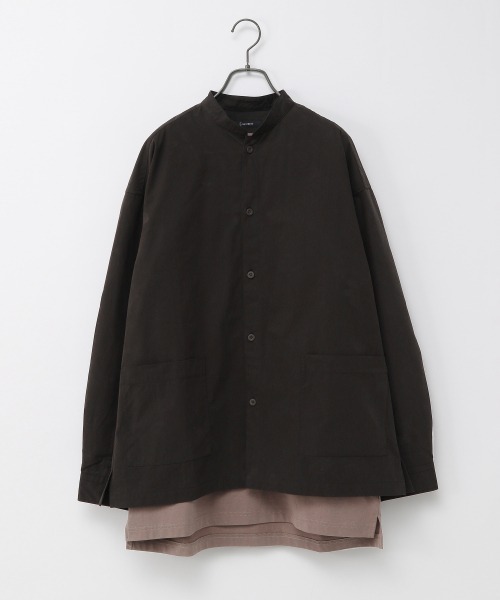 首元すっきりな、立ち襟のマオカラーシャツ! ハリ感のあるしっかりとした生地が特徴で、着用した時のシルエットが綺麗に出る逸品に仕上がっています。 また、裾はボックスシルエットなので、レイヤードスタイルも楽しめる逸品! ボタンを閉じて綺麗に着るもよし、春先はボタンを開けてライトアウター感覚でも使える万能アイテムです。