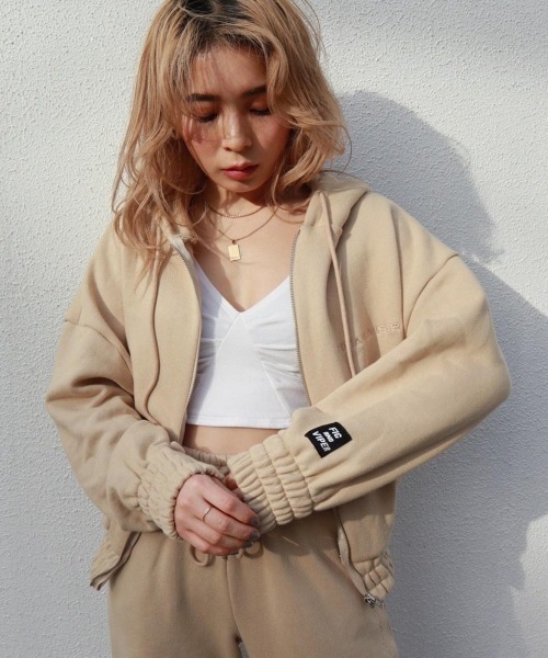 胸のロゴ刺繍と袖ワッペンがポイントになったヘビーショートフーディー。 ゆったりとしたドルマンシルエットで華奢見せ効果もバツグン◎ショート丈でウエスト位置を高く見せ、脚を長くスタイルアップして見せてくれます。 袖口と裾のギャザー使いもスタイリングにメリハリ感をプラス。同シリーズのパンツと合わせたセットアップもオススメ♪