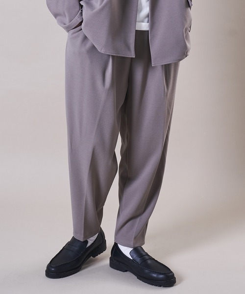 ---清涼感のある梨地を使用したリラックスワイドパンツ---【素材】光沢感がなくサラッとした肌触り、ドレープ感が特徴の梨地を使用。細かな凹凸が肌に張りつくのを防いでくれる為、夏に使用するアイテムにぴったりの素材です。【デザイン/シルエット】ウエストはゴム仕様のイージーパンツデザインを採用。トレンドのワイドシルエットを落とし込んだリラックス感のある印象。都会的でゆったりとした抜け感のあるサイジングで、旬なスタイリングを楽しめます。カラー展開も豊富な4色展開。同素材で展開しているダブルジャケットとのセットアップコーデもおすすめです。