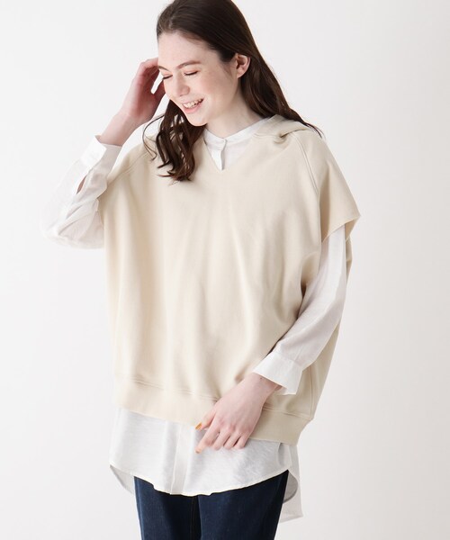 【デザイン】トレンドのレイヤードスタイルにおすすめの裏毛ノースリーブパーカー。かわいらしいコクーンシルエットとフーディでカジュアル感のあるアイテムです。ロンTやハイネックのインナーやシャツワンピなど、さまざまなアイテムとレイヤードして自分らしいスタイリングを♪【生地感】さらっとした表面感で、着心地の良い裏毛素材のコットン(綿)100%を使用しています。【補足】インナーは別売りです。モデル情報:身長170cm B80 W59 H85 着用サイズ:00店舗へのお問い合わせ商品番号:C62-12087●製品寸法:00(FREE):着丈61cm B130cm 肩幅63cm備考: