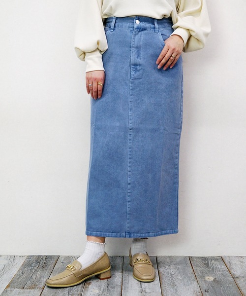 ピグメント加工が可愛いタイトスカート。デニム素材なので合わせるアイテムを選ばず、毎日着たくなるような使いやすさ。深めのスリット入りで、Iラインを際だたせてくれます。後ろ部分ゴムでサイドの見え方もスッキリ。※着用画像は、光の当たり具合で色味が違って見える場合があります。商品の色味は、スタジオ撮影の画像をご参照ください。