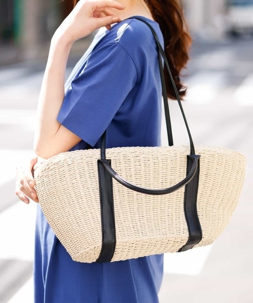 ◆荷物もたっぷり入る扇形カゴバッグ◆ハンドバッグ・ショルダーバッグ2WAYで使えるかごバッグ。フェイクレザーのハンドルはカジュアルすぎないこなれ感を演出。大容量の扇形のデザインなので、お荷物が多い際も安心です。これからの季節にピッタリの雑材トートとしておすすめです。