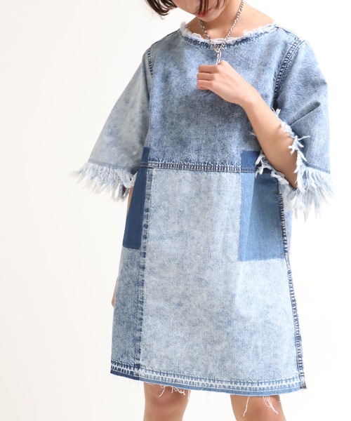 リメイクっぽい雰囲気がかわいいデニムBOXワンピ シンプルなBOXシルエットが合わせやすいデニムワンピース。 厚くて硬い素材のデニムワンピとは違い気軽に春~秋にかけてさらっと1枚でヘビロテしていただけるアイテムです。 着心地の良いデニムを選んだため、薄めで軽いのが特徴です。 一部、縫製前に生地の状態でブリーチした生地を使い、 縫製後、製品で更に加工することでパーツごとに部分的な濃淡を作り、リメイクっぽい雰囲気を出しています。 衿の開き具合、長めの袖丈、ひざの少し上あたりの短すぎない着丈で子供っぽくならず、 大人の方や、短めのスカートやワンピースが苦手な方にも気に入っていただけるシルエットです。 潔く1枚でスニーカーやボリュームのあるサンダルで、ベルトを付けずに合わせていただくのがおすすめです。 リブレギンスやカットソーパンツなどと合わせても可愛いいので、足を出すのが苦手な方にも着用していただけます。 お好みでセットのベルトでウエストマークしたり、デニムベルト単体でも可愛いので、いろいろなスタイリングを楽しめるアイテムです。 生地感:程よい厚みのやや柔らかな生地 透け感:なし 伸縮性:なし 裏地:なし ポケット:あり ※こちらは参考情報となります。多少の誤差はご了承ください。 ---------------------------------------------------------------------- ◆◆お気に入り登録しておすすめ情報をゲットしよう◆◆ 【商品のお気に入り登録】 再入荷、残り1点、セール、タイムセール、クーポンなど、 いち早く受け取ることができます。 【ショップ・ブランドのお気に入り登録】 新商品、予約商品、再入荷、ショップのおすすめトピックスなど、 ショップ・ブランドの最新情報を受け取ることができます。 ---------------------------------------------------------------------- ※画像の商品はサンプルです。 実際の商品と仕様、加工、サイズが若干異なる場合がございます。
