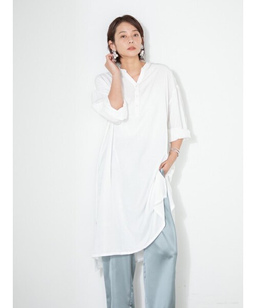 ヘンリーネックで、女性らしいヘルシーな印象に仕立てたシャツチュニック。 さらりと柔らかな生地と前後差のある丈感で体型カバーも叶う1着。 サイドスリットが足さばきのよさと程よい抜け感をプラスします。 カフスのリボンもアクセントになり、シンプルながらもディテールまでこだわったアイテムです。 ※モデル撮影画像は、光の当たり方により商品の色味が実際と異なって見える場合があります。予めご了承ください。 ※ご覧いただいていますモニターや使用環境により実際の商品と多少色が異なって表示される場合があります。予めご了承ください 【商品取り扱い上のご注意】 ■手洗い可能。 ■アイロンはあて布をして下さい。 サイズ:肩幅:56.5cm バスト:120cm 袖丈:46cm 着丈:(前)100cm (後)106cm 素材:ポリエステル:55% レーヨン:45% 原産国:中国製