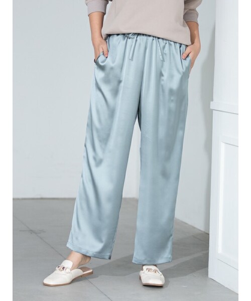 ルーズなシルエットに仕上げたサテンイージーパンツ。 なめらかで派手になりすぎない、上品なツヤ感が◎ ウエストはゴムとリボンで調節が可能。ストレスフリーの着心地です。 裾はサイドスリット入りで、程よい抜け感のあるデザイン。 オーバーシルエットのトップスと合わせて、旬なリラックススタイルにするのがおすすめです。 【商品取り扱い上のご注意】 ■石油系溶剤による弱いドライクリーニングが可能。 ■アイロンはあて布をしてかけて下さい。 ■粗い組織のものや、裏面に凹凸があって、ルーズな組織のもの、表面に糸が浮き出ているものはちょっとした不注意から引っかけてしまいがちです。取扱いの際は絵表示確認の上十分注意して下さい。 サイズ: (Sサイズ)ウエスト:63cm ヒップ:102cm 股上:26.1cm 股下:65.5cm 着丈:92.8cm (Mサイズ)ウエスト:66cm ヒップ:66cm 股上:26.6cm 股下:67cm 着丈:94.8cm 素材:ポリエステル:100% 原産国:中国製