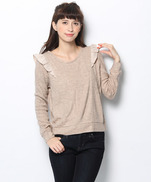 mystic(ミスティック) 肩のフリルがポイントのプルオーバー。リブ素材で程よくフィットするのですっきりと着て頂けます。 パンツにもスカートスタイルにもオススメです。