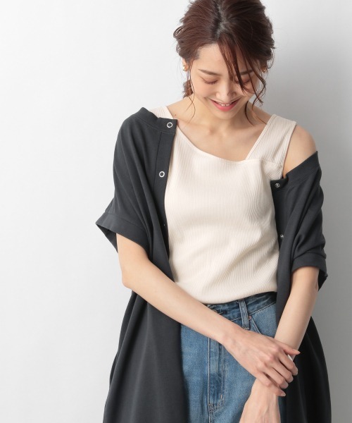 肌触りがよく着心地抜群 ロングセラーのアシメリブタンクが今季も登場! 肌触りが心地よく着心地抜群のテレコ素材は抗菌・防臭機能も付いた優秀インナーです。 アシメネックのデザインがポイントなので、上にシャツやカーデを羽織り襟元を女性らしく見せて下さい♪ シャツやカーデは抜き襟にするとこなれた着こなしになります。