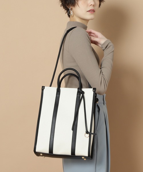 キャンバス地と合成皮革をミックスした大人顔なトートバッグ。すっきりした縦のフォルムに、口元は目隠しできるベロ付きで実用的です。通勤はもちろんカジュアルな日にも使いやすいカラーとデザインが魅力です。長さが異なるショルダーベルト付きです。