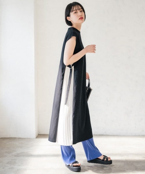 カットソー生地と布帛生地の異素材合わせが新鮮なデザインワンピース。
