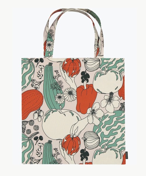 野菜や果物を繊細なラインで描き上げたTarhuri&Vihannesmaa(タルフリ&ヴィハンネスマー)プリントのファブリックバッグ。カラフルなルックスがスタイリングのワンポイントに。薄型でさっと折り畳めるため日常使いにはもちろん、旅行先などでも活躍するアイテムです。