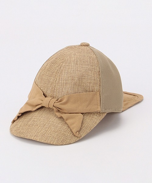 リボンを添えて甘い表情に仕上げたキャップです。ベースがナチュラルな風合いなので、デイリーからリゾートシーンにもマッチ♪ 首後ろを日差しから守る日よけ布は、面ファスナー仕様で簡単につけ外しが行えます。内側のスベリ部分には接触冷感生地を使い、ひんやりとしたかぶり心地です。日よけ布のポケット部分に保冷剤を入れることができます。