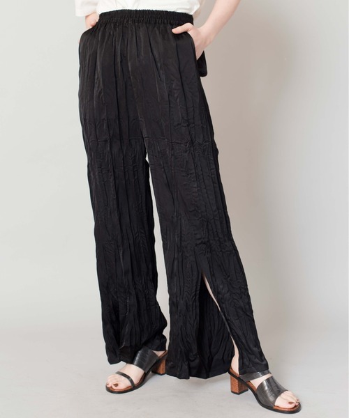 Spring Summer collectionランダムなワッシャー加工が、立体感のあるスタイルに仕上がるパンツ。上品なツヤ感とニュアンスカラーが大人っぽくも、フロントの裾にはスリットも施して、軽快で涼しげな印象へ。凹凸感の素材が脚のラインを拾わず、ウエストは総ゴム仕様でリラックス感のある履き心地も魅力。【素材】ポリエステル100%,IVORYのみ表地/ポリエステル100%裏地/ポリエステル100%【仕様】・ウエストゴム・サイドポケット2つ・IVORYのみ裏地有り【洗濯表示】洗濯機可洗濯:洗濯機使用可裏地有りです。ウエストゴム有りです。