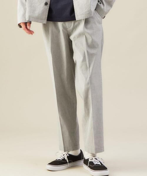 麻×ポリエステル×コットン×キュプラ素材を使用したパンツ。縦ストライプ調の柄ですが、一見すると無地見えする拘りの素材です。1プリーツ入りで程よくゆったりとしたシルエットですが、9分丈で仕上げすっきりとした印象。カジュアルスタイルはもちろん、プリーツ入りなのでキレイ目なスタイリングにもおすすめです。同生地でシャツジャケットもございますのでセットアップでの着用も◎。同生地のシャツジャケットは下記品番で検索ください。品番 : 32111993196-----------------------------------推奨着用シーズン:春~夏ケア方法 : 手洗い可-----------------------------------▼お気に入り登録のおすすめ▼気になる商品は「お気に入り」登録がおすすめ!お気に入り登録商品は、マイページにて現在の価格情報や在庫状況の確認が可能です。お買い物リストの管理に♪是非ご利用下さい。店舗へお問い合わせの際は、全国のgreen label relaxing各店舗まで下記の品名/品番をお申し付け下さい。品名:CM キュプラリネンコード 1P/E 9L 品番:3214-142-3196
