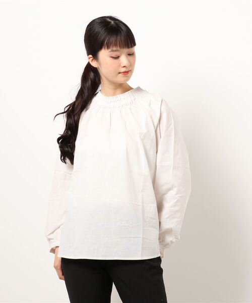 クシュクシュとした衿のシャーリングが、愛らしいニュアンスをプラスするブラウス。ふんわりボリュームのあるシルエットで、女性らしい優しげな雰囲気を演出◎綿100%素材のさらりとした肌触りで着心地も良く、デイリーユースにも重宝しそうなアイテムです。