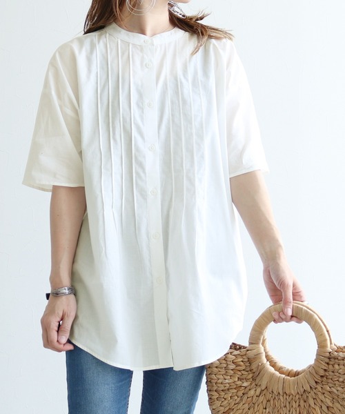 ■ポイントオンオフ問わずに着れるきれいめカジュアルなシャツブラウス。首回りはバンドカラーですっきり綺麗に見せてくれます◎フロントのピンタックデザインが大人っぽい雰囲気です♪長めの丈感が気になる腰周りのカバーにもピッタリ!■ディティール柔らかい肌触りで、ナチュラルな風合いのコットン100%素材。やや透け感のある薄手生地で、軽やかな着心地。■■■もっとお買物をお得にお楽しみいただくために■■■【商品のお気に入り登録】再入荷のお知らせや、ラスト1点のお知らせ、セールのお知らせを受け取ることができます!【ブランドのお気に入り登録】新作商品や完売アイテムの再入荷情報など、お得な情報をいち早く受け取ることができます!※サイズは現物をスタッフが平置き採寸したものになります。※モデル着用写真は撮影環境により、多少実際のカラーと異なる場合がございます。※生産時期により若干の色ブレやサイズの変動が生じる場合がございます。 生地の素材や種類によってシワになりやすいもの、または同じ素材でも製造時期によって異なる場合がございます。予めご了承くださいますようお願いいたします。