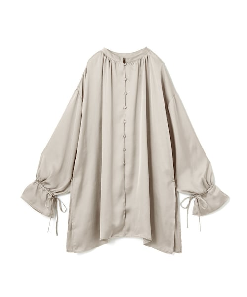 上品な光沢を放つサテン生地が大人っぽい仕上がりに。 キャンディスリーブが愛らしい手元に導く。 ロング丈やラウンドヘムがこなれた着こなしに。 前後2Way仕様なのでその日の気分でスタイリングの表情を変えられる。