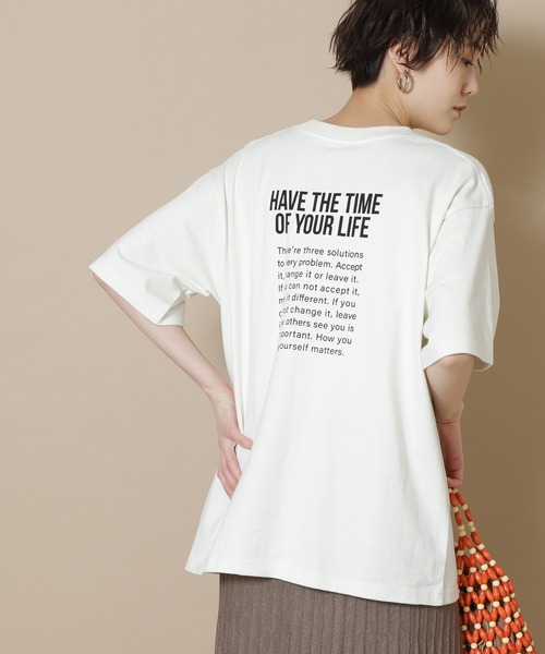 ストリート感のあるリラックスシルエットのロゴTシャツ。フロントは左胸、バックスタイルには大きくロゴプリントされたデザインです。ヒップまわりをカバーするイージーシルエットなので、裾アウトスタイルもしやすいです。袖先を折り返してショルダーラインに抜け感を加えても◎。カジュアルなアイテムは、落ち感あるスカートとコーディネートするのもおすすめです。