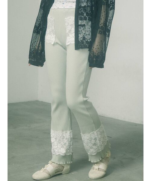 着心地の良いリブカットソーを使用した、フレアシルエットパンツです。もも周りはすっきりと、膝上から裾に向かって広がるフレアシルエットは足を細く、長く見せてくれる効果が。繊細なレースをポイントで重ね、フェミニンなアクセントをプラス。デイリーユースなitemです。