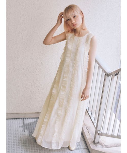 < LOOK use item >シアーな素材感とたっぷりのフリルは、ときめきがとまらないコンビネーション!Aラインシルエットで仕立てたワンピースは、フルレングス丈にすることですっきりと大人な表情に。Hatやカーディガンを合わせたり、プラス1でもstylingを楽しめる1着です。*製品はサンプルよりも着丈が5cm短くなります。