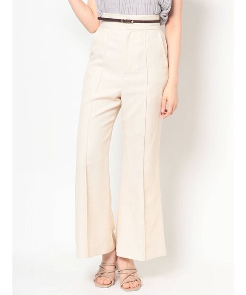 \スタイルアップが叶う!/華奢な太さのベルトがセットになった、大人っぽいフレアパンツです。腰回りはフィットしながらも程よいゆとりのあるシルエットが抜け感をプラスしてくれます。アイボリーとライムは夏らしい麻調のシボがありつつも、しわになりづらい合繊素材を使用しています。ピンクは少し艶っとした合繊素材で、他の色とは違い、ベルトにパイソンを使用するなどアクセントを加えています。▼スタイリングヒールのサンダルなど、足元に女性らしさをプラスしたスタイリングがお勧めです。----------------------------透け感:なし裏地:あり----------------------------▼おすすめスタイリングアイテム・2WAYラッフルコンパクトリブニット 002122600501・ チュールドッキングコンパクトニット 002132600801・ クリアヒール雑材サンダル 002121800501【 ZOZOTOWNでお買い物を楽しむ便利機能 】♡商品のお気に入り登録完売カラーの再入荷時、ラスト1点の時、セール開始時にお知らせします。予約アイテムが入荷して通常販売になった時もお知らせしてくれます!その他お得な通知も盛りだくさんです。♡ブランドのお気に入り登録新商品や再入荷、セール情報など、いち早くブランドのお得な情報を受け取ることができます。ぜひご活用ください!
