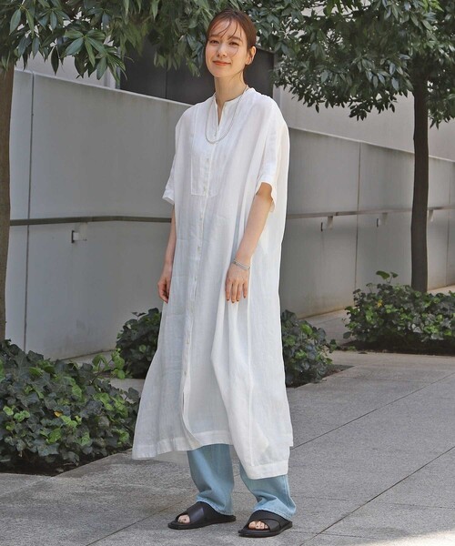 【夏のスタイルを軽やかに見せてくれる、ラミー製品染シリーズ】たっぷりとしたサイズ感と胸下切り替えのデザインが今年らしいビッグシルエットのワンピース。細幅のダブルステッチが華奢なイメージをプラスして女性らしい印象に。ラミーの繊細な素材感も相まってアンティークの様な雰囲気のある一枚です。100/1という細く繊細なラミーの糸を使用し、製品染めしてナチュラルな風合いに仕上げています。ラミーは麻の中で最も繊維が長く光沢があり、白度が高いので発色が良いのが特徴です。タイトなトップスにスティックパンツを合わせて透け感を楽しんだり、Tシャツにショートパンツのスタイリングに羽織るのもおすすめです。足元は華奢なサンダルで抜け感を。こちらの商品は主に夏に着用いただける商品です。モデル情報:身長175.5cm B74 W57 H86 着用サイズ:38(M)店舗へのお問い合わせ商品番号:085-52080●製品寸法:36(S):着丈116cm B160cm 裄丈48cm38(M):着丈120cm B166cm 裄丈49cm備考: