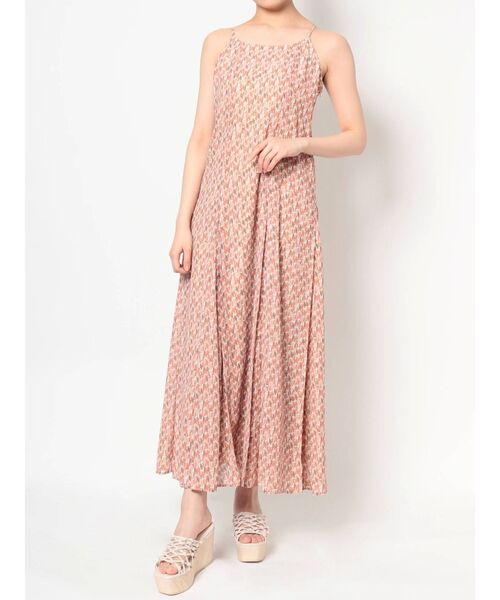 トレンドのジオメトリックプリントはオリジナルで図案から起こしています。 繊細な柄にすることで、遠くから見ると一見同色っぽく見え、レトロ感を抑えられます。 ホルターネックの様にキャミ紐を後ろ中心でまとめて結んだり、通常のキャミの様に左右で肩紐を結ぶことが出来き、着こなしの幅があるのがポイントです。 スカート部分にはたっぷりとマチを入れて華やかなフレアシルエットをかなえています。 【スタイリング】 一枚で着て、上にざっくりとしたカーディガンを合わせてもよいですし、逆にコンパクトなニットを中にレイヤードして着るのもお勧めです。 着丈はサンプルより4cm短くなります。