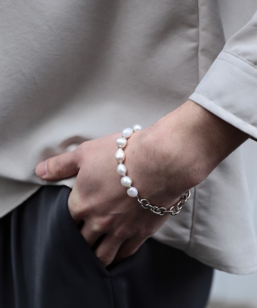 淡水パールとアスキチェーンをMIXしたモード感のあるブレスレット。大振りな淡水パールは凹凸があり、表面感に自然な光沢のある物を使用しています。中性的な印象ながらメンズでも使いやすいデザインにとして今シーズン抑えておいて間違いないアイテムです。