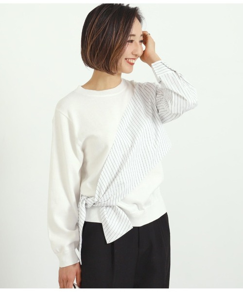 異素材切り替えのリボンデザインが女性らしいプルオーバー。 1枚でスタイリング映えする存在感のあるアイテムです。 【STYLING】 テーパードパンツやスラックスと合わせると◎ オフィススタイルにもオススメです。 フレアスカートと合わせたフェミニンコーデまで幅広くお使いいただけます。 【DETAIL】 身頃はラフに着られるニット素材でキレイ見え。 左袖部分は肌見せデザインになっております。 袖部分は左シャツ素材、右ニット素材。 切り替えデザインがフェミニンな印象のトップスです。 ※一部ストレッチあり ※裏地なし ※オフホワイトは若干透ける素材になっております。 ※生地のデザイン上、実際の商品と画像とで柄の配置が異なる場合がございます。予めご了承ください。 ※無地部分は、伸縮性があり記載しているサイズと若干異なる場合がございます。予めご了承ください。 ※商品のお取扱いに関しましては、商品に付属のアテンションカード、洗濯ネームをご覧ください。 ※モデル着用画像は光の当たり具合で色味が違って見える場合がございます。 実物の商品の色味はマネキン着用画像をご参照ください。 【お買いものをお楽しみいただく為に!】 ▼商品のお気に入り登録 完売カラーの再入荷通知や、ラスト1点の通知、セールの通知も受け取ることができます。 ▼ブランドのお気に入り登録 新商品や再入荷など、いち早くブランドのお得な情報を受け取ることができます。