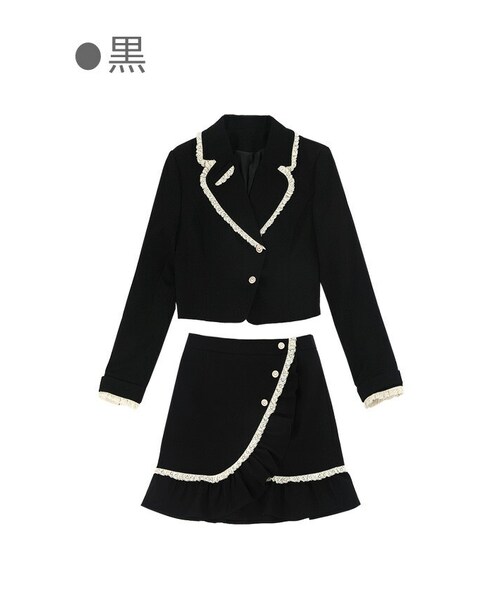 ロマンチックなディテールに加えてフォーマル感も演出 華やかパールボタン+ヴィンテージレース より一層クラシカル&フレンチな雰囲気に ショート丈ジャケットはキリっとした印象 スカートは内側スカパンの安心仕様 フェイクラップデザインでフェミニン感UP 統一感ある上下SETUPはシックな「黒」の1色展開 同じデザインの柄違いセットも販売中だよ
