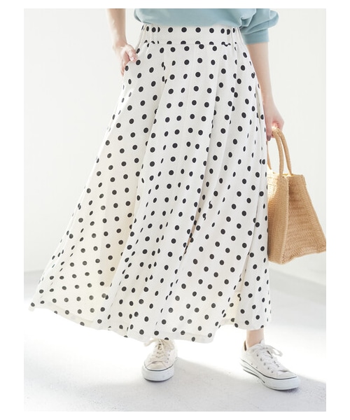 ドット柄がポップなアクセントに映えるロングスカート。 タックをいれた綺麗に広がるフレアシルエットが、エレガントな女性らしい印象に。ウエスト部分はゴム仕様になっているので安心感のある穿き心地です。 落ち着いた配色でバランス良くスタイリングでき、カジュアルから綺麗めコーデにと、幅広い着こなしが楽しめます。