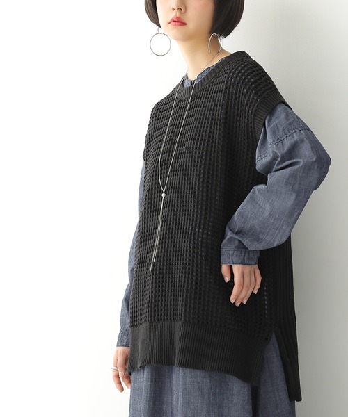 『いつものコーデをアップデート。』合わせるだけでお洒落を格上げする、メッシュ編みニットベスト♪メッシュ編みとリブ編みを切り替えたニットが、お洒落なセンスを高めてくれる。前後で着丈差をつけたサイドスリットだからレイヤードもしやすく、裾からお手持ちのトップスを覗かせるだけで旬な着こなしが完成します。柔らかな綿混の生地は、さらりと軽やかな心地よさを実現♪こなれた大人女子の褒められitem、ケーブル×メッシュニットベストです。