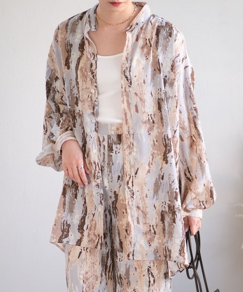 同柄のパンツとセットアップにも。華やかなペイント柄が映えるオーバーサイズシャツ。さらっとした落ち感のあるジョーゼット生地でシワになりにくいのが嬉しいポイント。ビッグシルエットなので体型カバーにも◎。夏には軽い羽織りとして使えるのでロングシーズン活躍すること間違いなし。同じ柄のパンツと合わせればセットアップとしても使えます。■コーディネートアイテムパンツ…bf77c04878パンツ…bf76x04605パンツ…bs77c04524パンツ…bc80c04515■商品仕様ジョーゼット生地裏地…なし伸縮性…なし透け…淡色のみありポケット…なし付属品…なし着脱…前開きボタン※ボタンの仕様は変更される場合がございます。※製造の都合上、モデル写真・商品写真とは柄行きが異なる場合がございます。※製造の都合上、柄のつなぎ目にズレが生じる場合がございます。※淡色は透けますのでインナーの着用を推奨します。【ご購入前に必ずご一読下さい】※モニタ環境によって、商品の色合いが多少異なる場合がございます。※色落ちの恐れがありますので、他のものと分けてお洗濯して下さい。※商品をお安く提供させて頂く為、検品後のアイロン掛けは省略させて頂いています。発送時も簡易梱包の為、お受け取り時にたたみ皺があると思いますがご了承下さい。