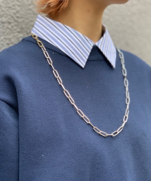 さりげないツートンカラーがアクセントに! ・ゴールドとシルバーのツートンカラーデザイン ・大きすぎないサイズ感でシーン毎に使いやすい ・シンプルながらも、トレンド感をプラスできる 【生地・デザイン】 コーデのさりげないアクセントになりそうなロングネックレス。シルバーとゴールドのツートンカラーで、トレンドの中にも新鮮味のあるデザインです。チェーンのかける位置で見え感が変わってくるので、様々なシーンで活躍してくれます。比較的華奢なので、インパクトが強すぎず、使いやすいサイズ感なのもポイントです。 【コーディネート】 長めのデザインなので、ハイネックトップスの首元に合わせるのがおすすめ。小さめのチェーンなので、派手過ぎずにお使いいただけるのでキレイめスタイルにもマッチするのも嬉しいポイント。