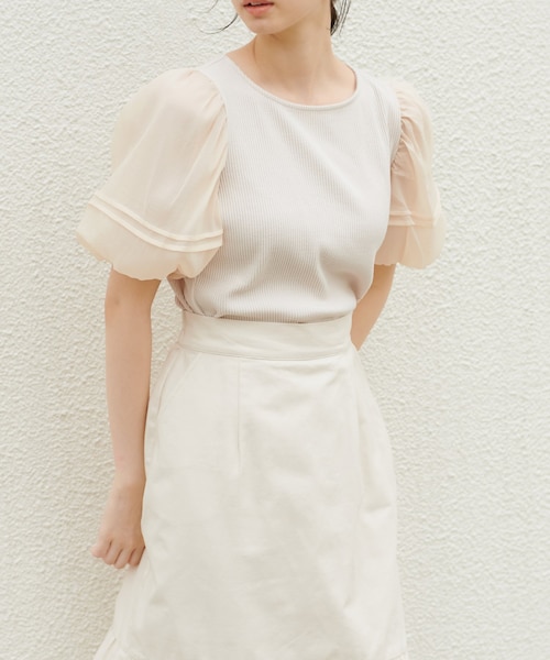 ときめきが詰まった袖異素材パフスリーブ ・肌になじむリブ素材にシア感のあるバルーン風ボリュームスリーブが特徴の異素材コンビ。 ・ストレッチ入りのボディにメリハリのあるボリュームスリーブがシンプル見えする、こだわりの詰まったアイテム。 ・身頃は柔らかいテレコ素材なので、上半身もボリュームが出ずスッキリとしたシルエットで着用できます。 ・さりげなく着るだけで、おしゃれな雰囲気に。 ・ワードローブに一枚あるとコーデ映えするカットソーです。 ■スタイリング ・ガーリー派にはミニボトムやジャンスカ合わせが◎ ・スラックスパンツに綺麗め合わせや、デニムにでカジュアル合わせ、オトナ見えするスタイリングもおススメです。 model:167cm 着用サイズ:FREE ※ご覧のモニター環境や撮影環境により実際の商品と多少色味が異なって見える場合がございます。 ご理解の程よろしくお願いいたします。