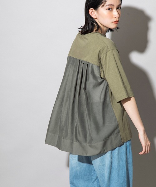 ★好評につき、今年も再登場!!★□2021 SPRING&SUMMER COLLECTION□◆異素材を組み合わせたボリュームたっぷりの後ろ姿がオトナかわいい!シンプルなTシャツ◆<MATERIAL>高品質な超長綿の原料を絶妙な番手に仕上げ、綿麻の糸を交編した新素材です。極限まで毛羽をそぎ落とし、布帛のようなクリアな表面感に仕上げました。麻のナチュラル感が絶妙にMIXされた上質でカジュアル素材です。後ろ身頃の別布は、タックの形がしっかりと出るハリ感と、程良いシアー感、光沢感が特徴です。布帛ですがシワになりにくく、イージーケアなのでカットソーとのドッキングにはぴったりの素材です。<DESIGN>フロントはシンプルでオーソドックスなTシャツ型のデザインですが、バックスタイルは同色系の異素材でタックを施しボリューム、立体感を加えたデザイントップスです。透け感のある異素材で、重くならず軽い印象に仕上げました。ベースはゆったりとしたTシャツ型で、肩はややドロップし、肘を隠してくれる大人袖なので、ロールUPして好みの丈で着用していただけます。<COLOR>■ホワイト:夏らしく軽い透け感が涼しげな白。は爽やかで清涼感たっぷりです。下にキャミソールやタンクトップをお召になると安心です。■カーキ:グレーが強めのクールなカーキ。一般的なカーキほどカジュアルではないので大人っぽく上品に合わせていただけます。■ネイビー:濃紺に近い、深い色合いのネイビー。ベーシックで細見え効果も期待できるカラーです。■レッド:品のある落ち着いたトーンのダークレッド。一枚で華やぐので、コーディネートのアクセントにぴったりです。*お取扱いについては、商品についております品質表示にてご確認ください。洗濯:洗濯機使用可.............................≪INFORMATION ≫............................▼商品のお気に入り登録▼『♡』マークを押してお気に入り登録して頂いた商品は、セール開催の通知やクーポン発行などのキャンペーンなど、お得な情報をいち早く受けとる事が出来ますので、ぜひご登録ください。