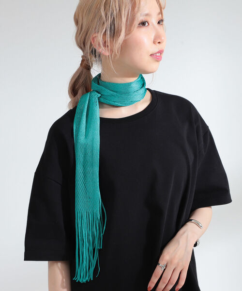 プラスワンでこなれ感をフィッシュネットの編み目とフリンジデザインが特徴的なスカーフ。細めなデザインなので首元にプラスワンしたり、ウエストマークとしてもお使いいただけます。カラーは合わせやすいブラックと差し色にぴったりなターコイズの2色展開。普段にプラスして、こなれ感のあるスタイリングをお楽しみください。