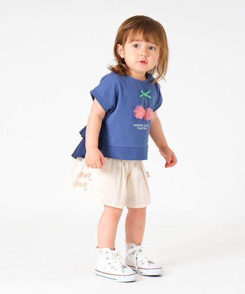 チャーミングなリボンをサイドに添えたキュロットです。トップスを選ばない定番の無地デザインは、ワードロープに備えておくと便利♪ ウエスト裏の花柄やてんとう虫刺しゅうに自然な可愛さがあり、お出かけスタイルにピッタリです。アジャスターゴムつきでフィット感の調節が行えます。