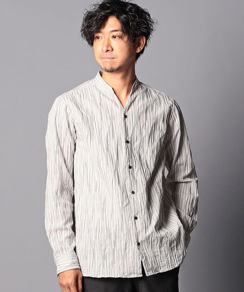◆Stutostein◆ ランダムにタックの入ったピンタックストライプ素材を使用したスキッパーバンドカラーシャツ。 羽織でも着ていただけるようボクシーなシルエットになっていて、裾もフラットなデザインになっています。 ※お取扱い上のご注意 アテンションタグを必ずご確認の上、着用又はお取り扱い下さい。