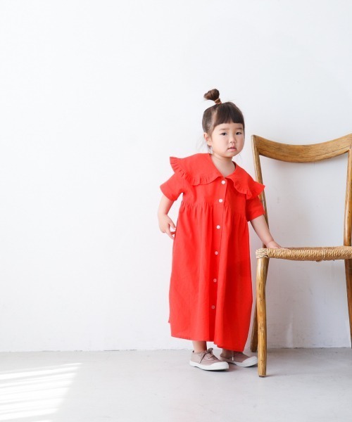 大きなフリルの襟がポイントのワンピース。 発色の良いカラーにフロントボタンの白を利かせているのがポイント! 一枚でシンプルに着たり、羽織として着たり着回しの効くアイテムです! オーバーオールなどボーイッシュなアイテムに羽織るのも可愛いです!!