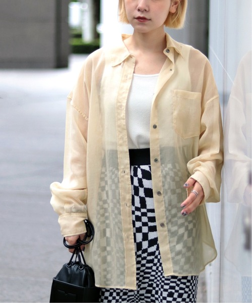 昨シーズン大好評だったシアーシャツがアップデートして登場!程よいハリと落ち感のあるオーガンジー素材を使用し、今年はオーバーサイズになっています。オーガンジーにありがちなチクチク感もなく、ストレスフリーで着ていただけるのもポイント!ご自宅でケアできるも魅力です◎。キャミソールやタンクトップの上に羽織ったり、ロゴTを重ねてカジュアルなコーデもおすすめ。一枚あると便利でトレンド感のあるコーディネートが叶います!※取り扱いについては、商品についている品質表示でご確認ください。※店頭・外での撮影画像は、光の当たり具合で色味が違って見える場合があります。商品の色味は、スタジオ撮影の画像をご参照ください。※摩擦や引っ掛けに気を付けてください。**********************透け感:あり裏地:なし伸縮性:なし光沢感:ややあり生地感:薄い生地の厚さ:薄い**********************【スタッフ着用コメント】《スタッフ minori》年齢:20代後半/身長:161cm/体型:痩せ型/普段サイズ:S・M/着用サイズ:フリーサイズサイズ感:全体的にゆったりしており、羽織りとしても着られるサイズ感。素材感:さらっとしている着心地:ゆったりしているので、窮屈のない着心地**********************洗濯:手洗い可