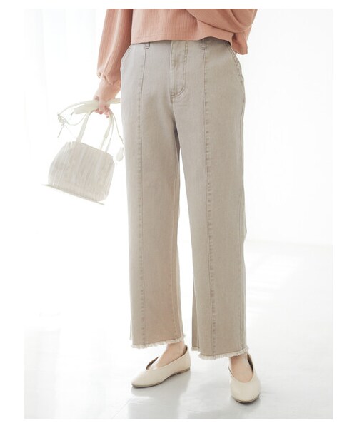 センターシームが縦長感を強調し、Iラインですっきりスタイリング出来るツイルパンツ。 脚長効果も期待できるハイウエスト仕様も魅力的なポイント◎ ウエストは背面がゴムギャザーになっており、穿き心地の良さをアシストしてくれます。 味わいのある色落ち加工や裾のカットオフも、スタイリングにこなれたニュアンスをプラス。定番のカジュアルコーデの鮮度も高まりそうなアイテムです。