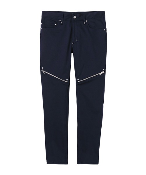 腿部分のファスナーが目を引くスリムパンツ。細身のシルエットですが、強いストレッチ性があるためとても穿きやすいです。バックポケットはヨークを重ね合わせ三重に。ポケット縁、ベルトループに打たれた鋭い輝きを放つオリジナルリベットがベースの色を引き立たせています。腿部分にはオリジナルエクセラファスナーを使用し、開閉により印象を変えることができます。日本アートの重鎮「ヒロ杉山」氏に書き起こしてもらったオリジナルキャラクター「ブッチャーさん」が刻印されたレザーパッチはヴィンテージ加工されておりタックイン時に存在感を発揮します。MODEL: MEN 186cm SIZE 2/M, WOMEN 175cm SIZE 2/M※セールは予告なく終了する場合がございます。※商品を受け取ってから8日以上が経った商品、ブランドタグや梱包を失くされた商品、また、着用感が見られる商品は返品交換を受け付けられないことがございます。予めご了承くださいませ。【DIET BUTCHER (ダイエットブッチャー)】DIET BUTCHER は2022S/S COLLECTION よりブランドの歴史に縁のあるディレクターを含むクリエイティブチームに一新。匿名性、曖昧、不完全、グレー、といった言葉が持つ「余白」や「自由度」の探究をコンセプトに。ブランドロゴのリニューアル、直営店舗名を「DB&BAR」と改め、人と人の交流がうながされるようにバーエリアの併設、コレクションのビジュアライズを慣例にしたがわない、といった感じでリニューアルはブランドのあり方全体にわたる。
