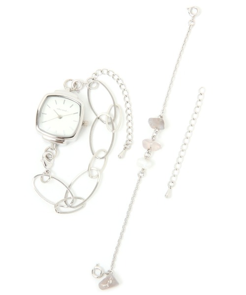 着せ替えが楽しめるアクセサリーウォッチデザインの異なるブレスレット2本、アジャスター、時計のセットアイテム。コーディネートや気分に合わせて、服を着替えるように付け替えて様々なスタイルが楽しめます。2連ブレスウォッチとして使用したり、ブレスレット単品で付けても◎文字盤はシンプルに見やすく、華奢なチェーンが華やかで女性らしい印象に。手持ちのアクセサリーとも相性の良いカラーで、シーズン問わず活躍してくれます。※商品と同梱されている納品書が購入の証明書となりますので、なくさずに保管してください。※この製品は天然素材を使用しております。一点一点風合い・色・形などに個体差があります。他の製品では味わえない雰囲気をお楽しみください。