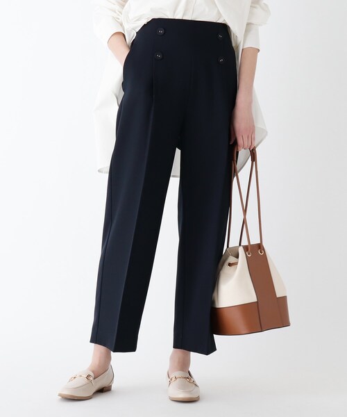 【デザイン】 フロントにボタンをあしらったマリンパンツ。 パンツと同色のサテンでくるんだボタンは高級感を演出。 あえてクロプド丈で足首を見せる事で抜け感と女性らしさがうかがえます。 ON/OFFとシーンを選ばず着用できます。 【素材】 シャリ感のあるさらっとした肌触りで、通気性の良い中肉厚のストレッチのきいたポリエステル素材。 タテ、ヨコに伸びる伸縮性を持つ、快適な着心地の素材。 ご家庭のお洗濯で洗濯できるのも嬉しいポイントです。 ※ポケット数:横×2、後ろ×2 ※ベージュ(052)のみショート丈裏地あり こちらの商品は主に春に着用いただける商品です。 モデル情報:身長166cm B72 W57 H84 着用サイズ:38(M) 店舗へのお問い合わせ商品番号:637-62057 ●製品寸法: 34(SS):W60cm H95cm 股下60cm 36(S):W63cm H98cm 股下60cm 38(M):W66cm H101cm 股下61cm 40(L):W69cm H104cm 股下63cm 42(LL):W72cm H107cm 股下63cm 備考: