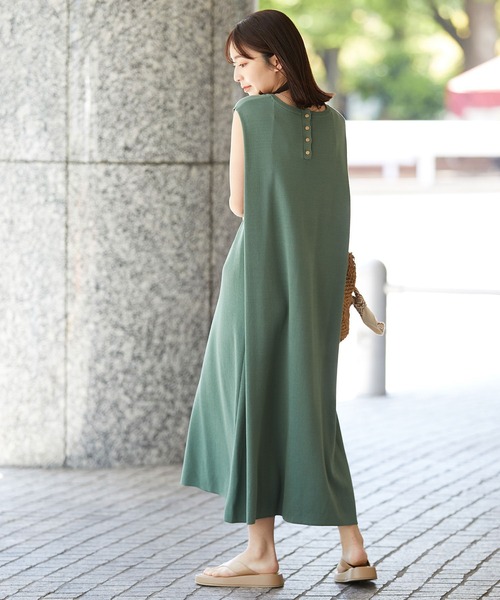 夏まで活躍!ヘルシーなノースリーブのニットワンピ。 【デザイン・シルエット】 肩にタックを入れて後ろに立体感が出るように仕上げたニットワンピースです。 しっかりとした総針の編み地を使用し、きれいなAラインに広がるシルエットに仕上げました。 後ろの衿のところに小さめのメタル釦を使ってキラッとしたポイントを入れています。 体のラインを拾いにくく、透けにくい編み地にしているので、ワンピース一枚でさらっと着ていただけます。 【素材】 透けにくくしっかりとした総針の編み地のニット素材。 【カラー】 大人カジュアルにぴったりな4色展開。 【おすすめのスタイリング】 一枚着のワンピースとしてはもちろん、デニムとのレイヤードでラフにスタイリングするのもおすすめです。 シンプルなのでアクセサリーや小物をポイントにすると◎ ----------------------------- 裏地:なし 光沢感:なし 透け感:なし ポケット:なし 伸縮性:あり 生地の厚さ:普通 季節:春~初秋 ----------------------------- 【モデル着用サイズ】 全色モデル身長:160cm、着用サイズ:F 詳細カットモデル身長:166cm、着用サイズ:F ブラウン着用スタッフ身長:154cm、着用サイズ:F ブラウン(後ろ)着用スタッフ身長:161cm、着用サイズ:F ダークグリーン・オレンジ着用スタッフ身長:156cm、着用サイズ:F ※画像の商品はサンプルです。 実際の商品と仕様、加工、サイズが若干異なる場合がございます。 ※室外で撮影している画像は、光の影響で色味が若干異なって見える場合がございます。
