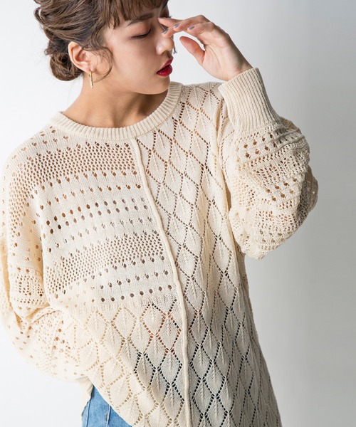 【デザイン】柄をパッチワークしたルーズなシルエットのニットトップスは、インナー次第で見え方も雰囲気も変わり、レイヤードスタイルも幅広く楽しむことが出来るアイテム。糸もサラッとしていて夏まで長く着れます。【MODELサイズ】■オフホワイト | MODEL(メイン画像):身長 165cm / B 81cm / W58cm / H84cm■ベージュ | MODEL(メイン画像):身長 165cm / B 81cm / W58cm / H84cm■サックス | MODEL(メイン画像):身長 165cm / B 81cm / W58cm / H84cm【MODEL着用サイズ】Fサイズ<スタッフレビュー>■スタッフ・K身長:158 体型:普通 普段の着用サイズ:Mヒップが隠れるくらいの丈で、かなりゆったり着られるサイズ感です。脇にスリットが入っていて前後で若干丈が違うので前だけインするのも可愛いと思います。網目でつくられた柄が主張しすぎないのでコーディネートしやすいです。